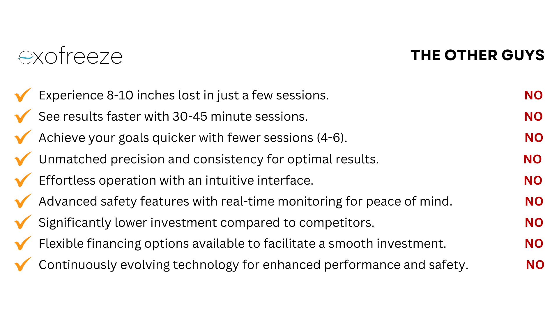 The Exofreeze AdvantageThe latest technology and the only known device to get results in HALF the time! Ready to see the Results for Yourself? BOOK A CONSULTATION